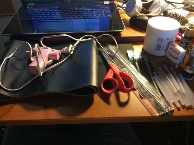 Pistola de pegamento caliente y pegamento caliente (mucho), tijeras, regla, Gesso, pintura (negro, rojo, blanco), arte de pincel espuma, tela negra de su elección (piel artificial de vinilo se utiliza en este tutorial), arcilla polimérica, cremalleras de dos a tres, cosa de encaje, hilo, máquina de coser y un montón de refs.