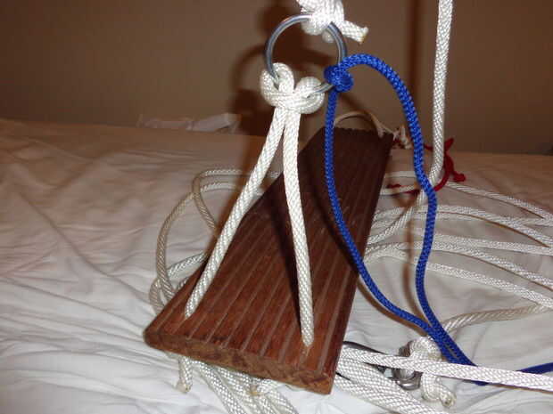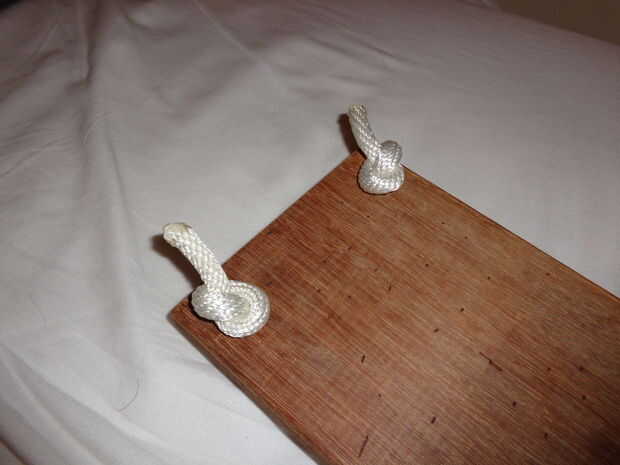 Tome un pedazo de cuerda que está a sólo unos 60 cm de largo. Asegúrese de que usar su encendedor en los extremos de la cuerda para que la cuerda se mantiene intacta. Ponga ambos extremos a través de un agujero. Hacer lo mismo en el otro lado de la pieza de madera. En la parte donde la cuerda viene a través debe atar la cuerda. Usted puede hacer esto haciendo un nudo simple pero estén muy estrecha. Puedes ver en la fotografía.