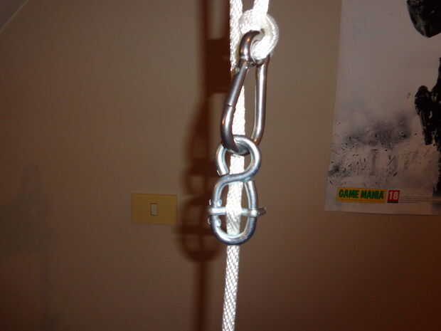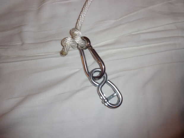 Cortar dos trozos de cuerda que son 6 a 7 metros de largo. Derrite el extremo de la cuerda como el paso anterior. Atar un extremo de la cuerda hasta el anillo del metal y el otro extremo a mosquetón. Enganche el mosquetón de su Ajustador de altura de la cuerda como en la imagen. Así que cuando tiro la cuerda sobre la rama tienes que bloquear la cuerda en el Ajustador de altura. Como se muestra arriba.