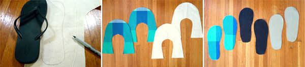 Medir la plantilla de traza alrededor del pies y zapatos de la tela anti-que patina con una 1/2 pulgadas más grande para dar cabida a un margen, (aquí olvidamos la plantilla vamp); corte cuatro piezas de tela anti-que patina, dos para la tela exterior y dos de tela única, dos piezas de fieltro, seis piezas de tela de algodón, dos Compruebe patrón y dos llano para la tela exterior, dos para el tejido de algodón único.