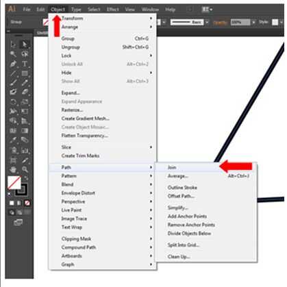 Después se agrupan los segmentos de dos líneas, seleccione el Panel objeto > trazado > Únete. Tenga en cuenta que esto sólo funcionará si los puntos de anclaje están alineados correctamente.