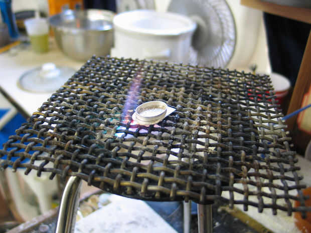 El bisel a una pieza plana de plata con el duro de soldadura o soldadura mediana Coloque los pequeños pedazos de soldadura en el interior de la luneta para más fácil limpieza. De calor desde abajo para evitar que se derritan el bisel y para controlar el flujo de soldadura. Salmuera, enjuague.