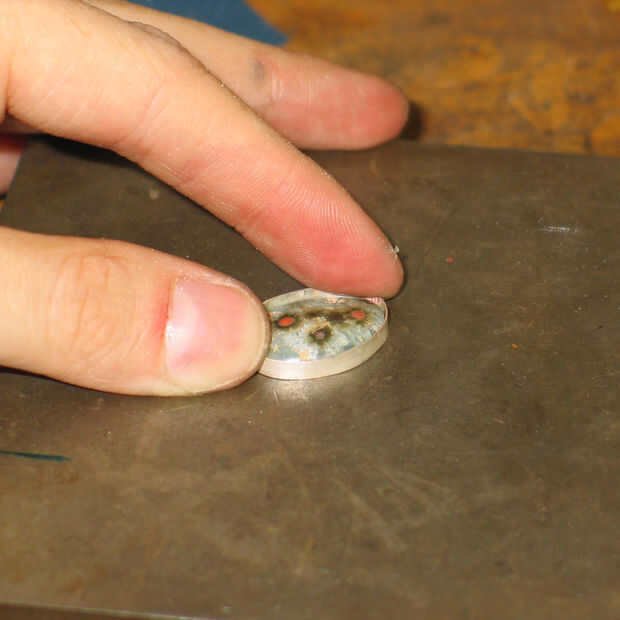 Forma de bisel alrededor de piedra empujando suavemente sobre la piedra con los dedos - que será muy suave y flexible (recocido) después de soldar ayuda a tener una superficie dura, lisa por debajo, como un bloque de acero.