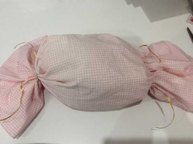 Cortar la cinta bastante en dos longitudes de 17 cm. empate en un arco alrededor de cada extremo más cercano al relleno. Asegúrese de que esté firmemente lo contrario todo se caiga el relleno.