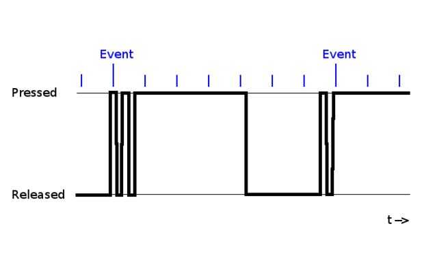 #define BUTTON_PIN 2 // Button #define DELAY 20 // Delay per loop in ms boolean button_was_pressed; // previous state void setup() { pinMode(BUTTON_PIN, INPUT); digitalWrite(BUTTON_PIN, HIGH); // pull-up Serial.begin(9600); button_was_pressed = false; } boolean handle_button() { boolean event; int button_now_pressed = !digitalRead(BUTTON_PIN); // pin low -> pressed event = button_now_pressed && !button_was_pressed; button_was_pressed = button_now_pressed; return event; } void loop() { // handle button boolean raising_edge = handle_button(); // do other things Serial.print(raising_edge ? "^" : "."); // add newline sometimes static int counter = 0; if ((++counter & 0x3f) == 0) Serial.println(); delay(DELAY); } ––––––––––>8––––––––––