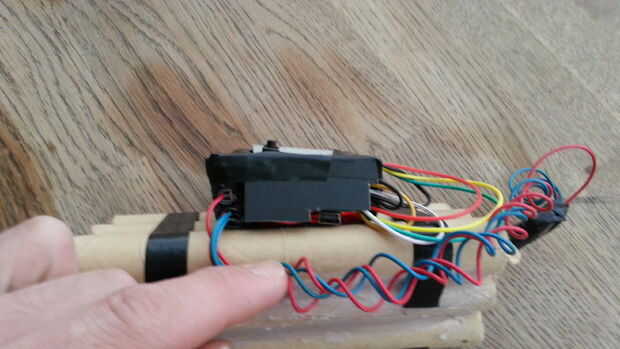 Ocultar gnd dentro de la caja. tan sólo falsa cables y + está saliendo debajo de la bomba.