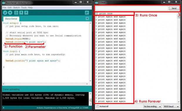 2 "imprimir una vez" es un parámetro de la función Serial.println(). El parámetro es su entrada a la función y la función en este caso dice a imprimir. Tratar de cambiar esto a otra cosa como "I love perritos" y ejecutar el código nuevo. Asegúrese de que rodean sus palabras con comillas ("").