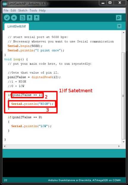 2. esta es la condición del if instrucción. ¿Esta es una pregunta, es pin12Value igual a 1? Si la respuesta es sí entonces la expresión se evalúa como true. Tenga cuidado y darse cuenta de que el == es diferente del signo =. == es una pregunta. ¿Son iguales? = es un comando ajuste cuál es el lado izquierdo sea igual a lo que está en el lado derecho.