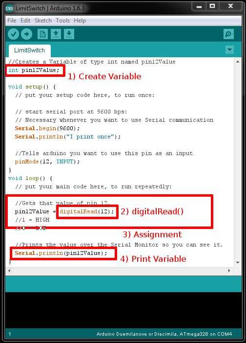 3. esta parte se llama una asignación. Estamos estableciendo pin12Value a un 1 o 0 dependiendo de si el interruptor se presiona y pin 12 es alta.