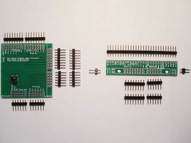 El kit incluye el principal tablero (izquierda en foto), el breakout Junta (derecha), pines macho, un pulsador, cable de cinta (no en la foto) y breakout extra una junta (no fotografiado).