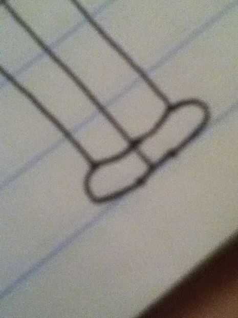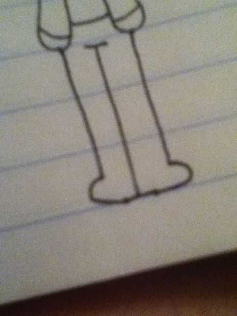 De todas formas, señalar una línea hacia abajo, semejantemente cómo se dibujan los brazos. Traza una curva que va hacia afuera y traerlo en el. Estas son sus vaqueros y zapatos. Repita en el otro lado. Entonces dibuje un super largo "T" en el centro.