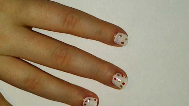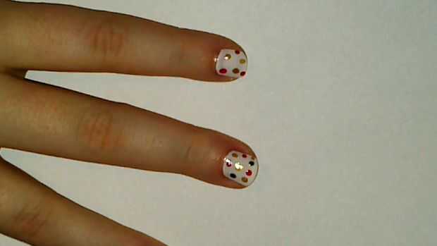 Ahora hacer puntos oro, rojos y verdes con el dooting herramienta en todas las uñas.