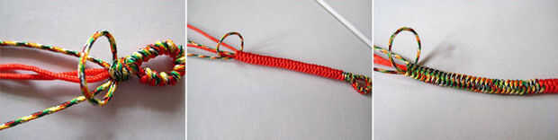 2. dejar dos cuerdas de color en el centro; trenza nudo con cables rojo de 5cm de largo.