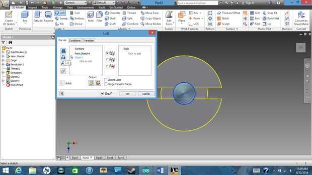 Loft se haga clic en el punto, presione añadir selección y haga clic en el círculo. Antes de pulsar Aceptar, en el lado izquierdo de la selección de caja la opción corte por lo que recortará las piezas de esquina.