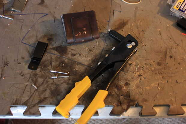 Colocar el resorte del metal clip es autoexplicativo simple Haz un remache y una pistola de remache y punch o cuidadosamente perforar toda la piel y del remache en la primavera para el cuero. Asegúrese de poner una arandela en el lado opuesto.