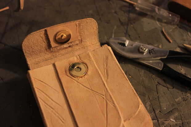 Para colocar un broche de presión del bolso magnético como se muestra por encima de toma simple algunos desecho de cuero y el uso de de que una cuchilla xacto cortar agujeros en el cuero de las patas ir a través. Doblar las puntas hacia afuera alrededor de la base y aplicar el adhesivo en la parte posterior de la aleta de la bolsa y el cierre. Fije las dos piezas y usarlas para alinear la otra mitad de la presión. Puede ocultar la presión en el cuero detalle cortando un agujero lo suficientemente grande para el cierre. De nuevo, utilice una cuchilla xacto para cortar las ranuras para el snap ir a través de la piel y fijar el respaldo.