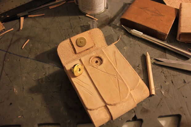 Si su uso de un tornillo botón back o el botón de Sam Brown simplemente su herramienta del sacador de cuero y hacer dos uno más pequeño entonces la bola en el botón y uno lo suficientemente grande para el tornillo del remache para recorrer.