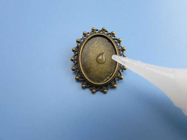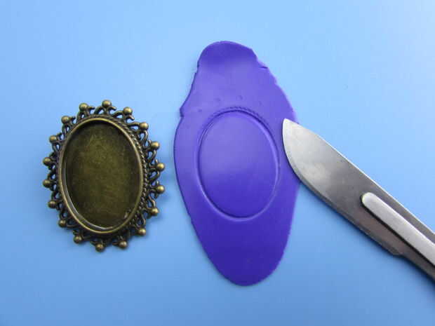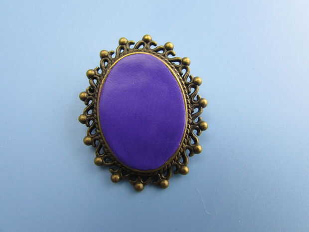 Para agregar un fondo al broche, impresionar en un pedazo de arcilla púrpura y cortar ese trozo con un cuchillo. Ponga algunos arcilla líquida sobre el marco y presione la arcilla.
