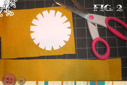 Pin el 4.5" base patrón de flor a un extremo del fieltro y recórtalo. Cortar una tira de fieltro 30" de largo por 2" de ancho.