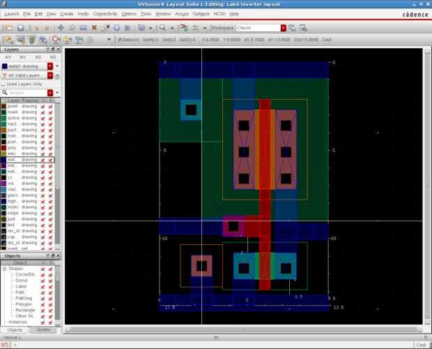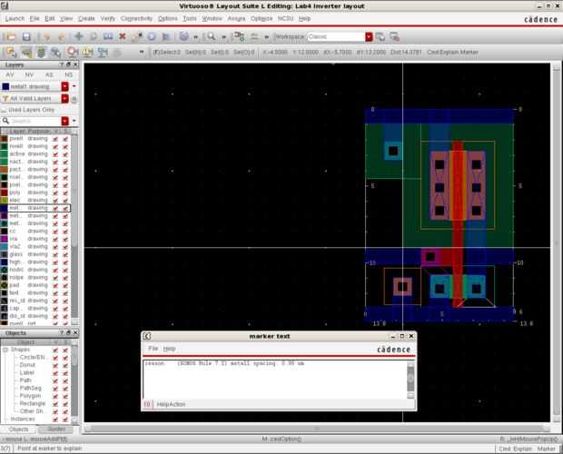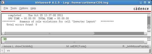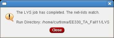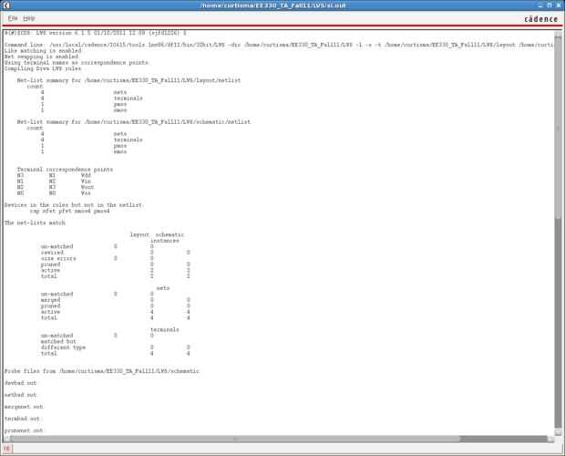 • Cuando el LVS se completa una ventana aparecerá con el estado de la prueba LVS. Si el windoe dice coincide con las "listas de red" indica que el esquema y el diseño son simailar