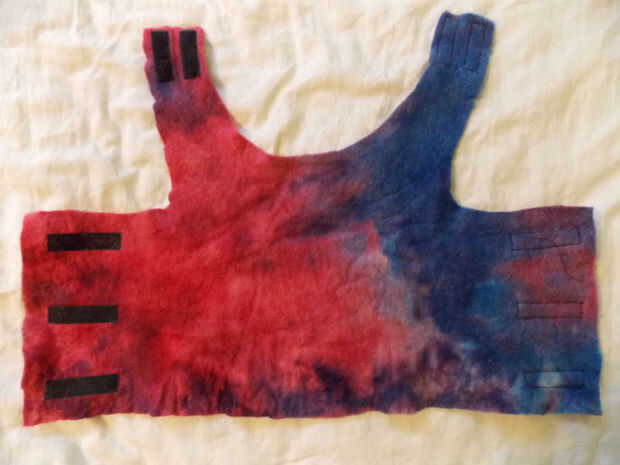 alrededor del torso y se ata con cinta de velcro en el vientre. Las piezas delanteras se enrolle alrededor del cuello para mantener todo en su lugar. Medido alrededor del vientre, el cuello y la longitud de su cuerpo para obtener el tamaño general de Maggie.