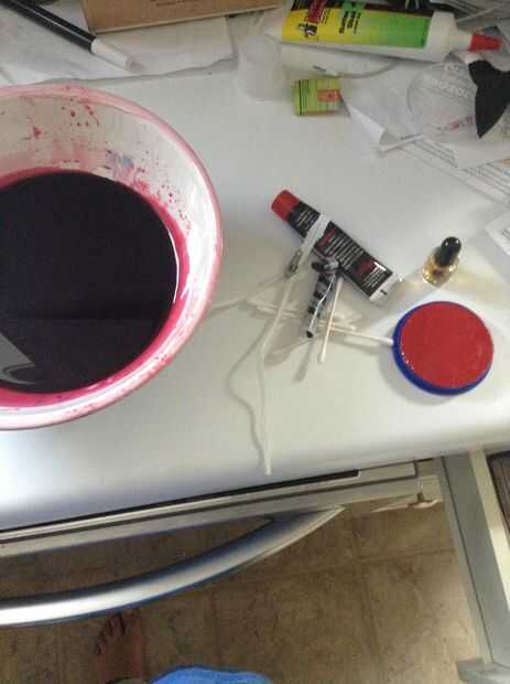 1. cremallera 2. Espíritu de goma o látex 3. Pintura de cara roja y negra 4. Q-tips 5. Falsa sangre (hecho en casa como en mi tutorial pasado o almacén comprado)