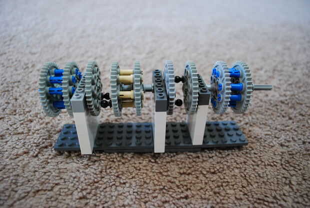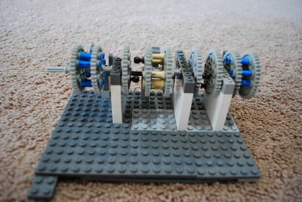 Ahora han metido todo el mecanismo. Estás listo para armar los segmentos. Poner el primer segmento en uno de los extremos (en la imagen usted puede verlo a la izquierda). Asegúrese de que la clavija está en el interior. Luego puso el segundo tramo justo al lado de él, en el interior, teniendo el engranaje solitario con la clavija de interactuar con la clavija del primer segmento. Por ahora, si se gira un segmento, el otro debe seguir después de una rotación. Entonces puso el último segmento después de la segunda, así que si se activa la primera de ellas tanto los demás se gire después de dos rotaciones. Coloque el sistema de apertura en el lado derecho, por lo que la pequeña "L" pernos de línea arriba en el centro de cada disco de engranaje ancho. Ahora seguro se acaba.