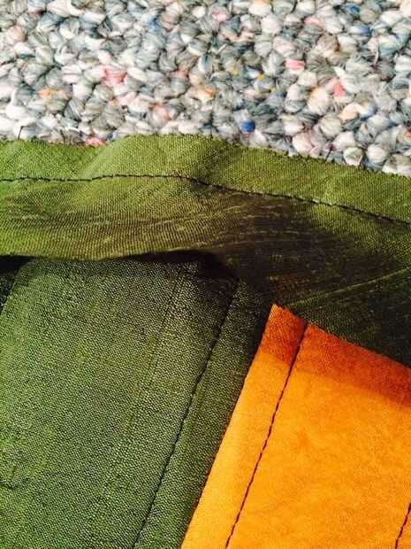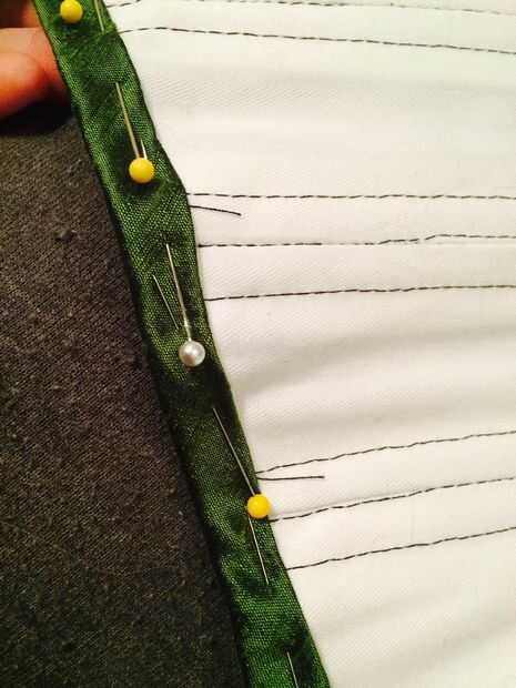 Enlazar arriba y abajo de su corsé. Usando una tira de sesgo-corte de la tela exterior aproximadamente 1 el 1/2" ancho, prender las tiras a la parte superior e inferior del corsé, dejando aproximadamente 5/8" de tela de extrudado de los extremos del corsé más allá de los paneles del ojal. Coser una costura de 3/8 para sujetar la pieza de corte diagonal para el corsé. Entonces, el pedazo de sobre manera que el borde de la tela bies no muestra (Img 2). Este perno en su lugar. Asegúrese de que esta pieza se extiende más allá de la costura que hiciste para colocar la pieza en el corsé, por lo que puede garantizar que se coser sobre él. Si desea handsew el atascamiento a la capa de coutil del corsé. O, en la zanja en el lado derecho del corsé para sujetar la Unión (img 3).