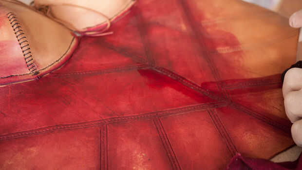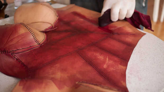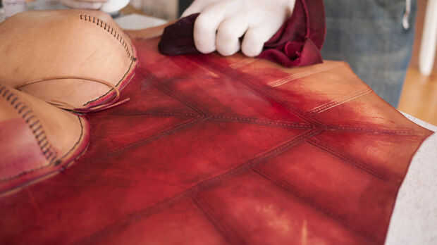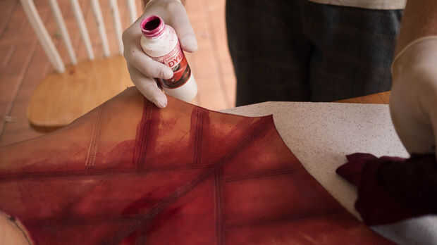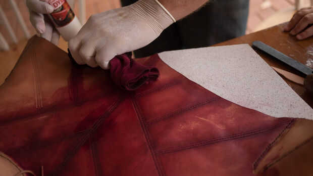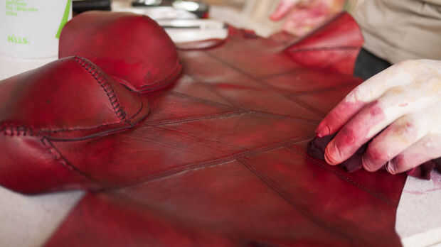 Aquí estoy usando un tinte acrílico cuero en un color rojo cereza. Su proveedor local si dispone de algo similar. Asegúrese de utilizar un tinte de estilo antiguo para llenar en todas esas líneas de puntada imitación. I utiliza un trapo para aplicarlo y comenzó primero en todas mis líneas de costuras.
