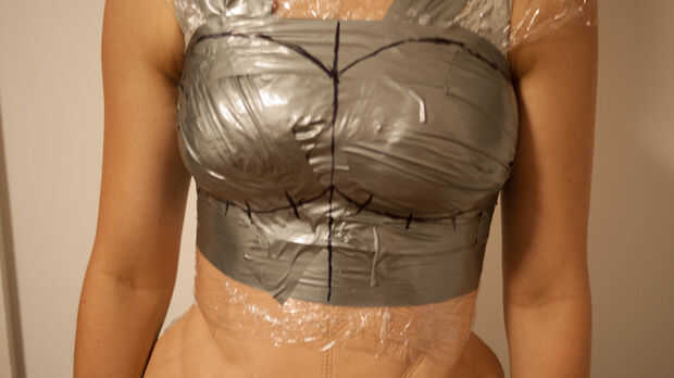 Comencé cubriendo su cuerpo en cling wrap (en Australia, abrigo de saran para la gente de Estados Unidos) y luego utiliza cinta adhesiva para crear un formulario sobre él. Me aseguré de abarcar más de lo que necesitaba y utilizan un marcador permanente para dibujar los contornos del diseño que estaba buscando para indicar las líneas de corte y donde se fijan piezas.