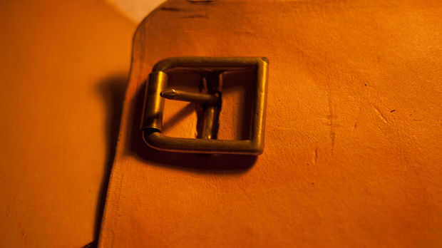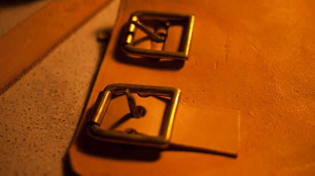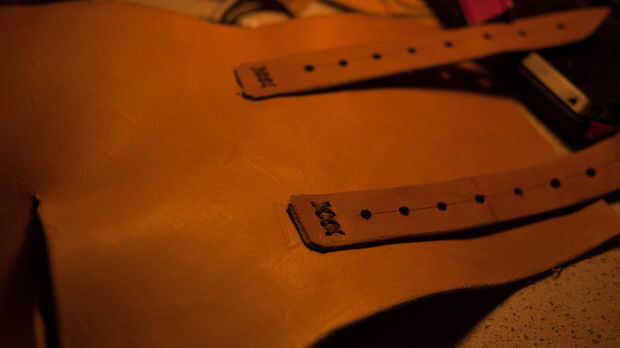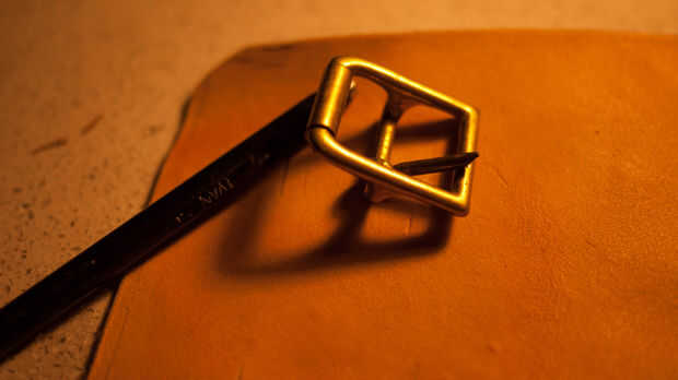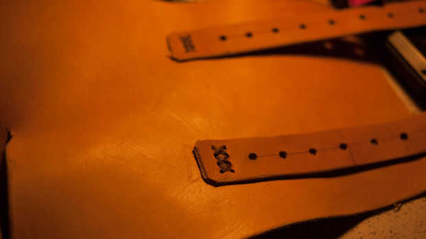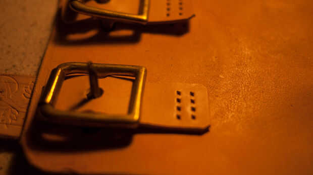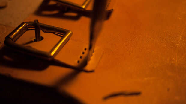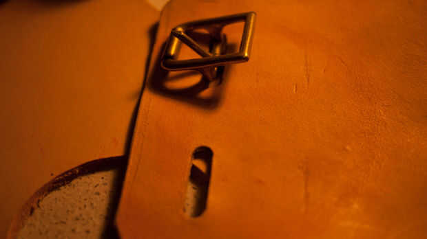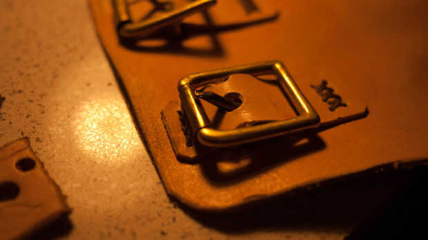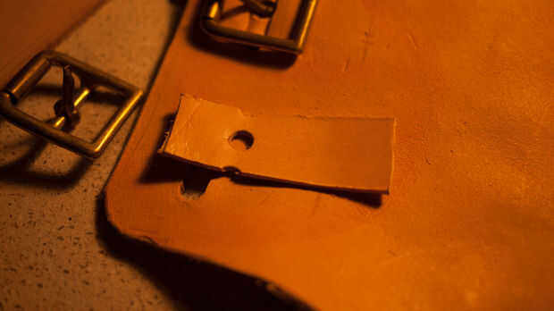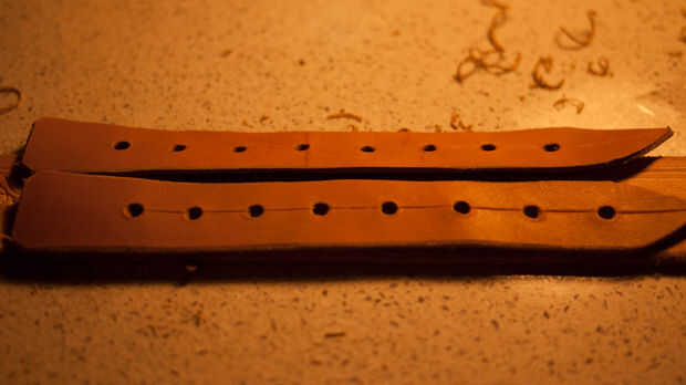 Marque estas mojando el cuero y luego pulsar en él para hacer una marca. Utilice una perforadora de cinta para hacer un corte claro de la hebilla en.