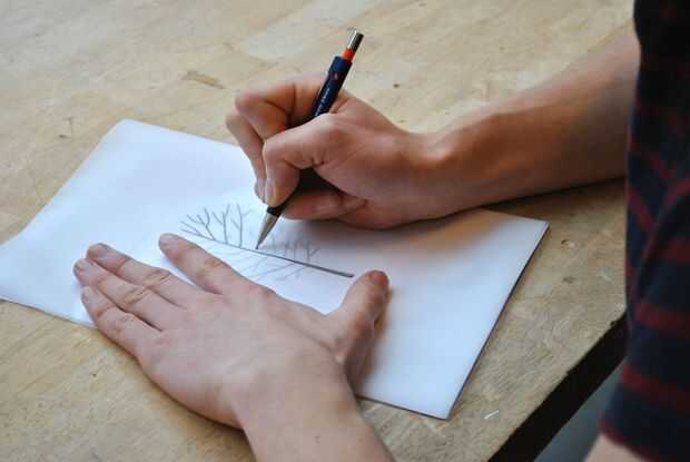 Cuando esté satisfecho con su diseño, puede comenzar a remontar en un pedazo de papel con un lápiz. No tienes que dibujar la letra en la revocación. El papel nos ayudará a dibujar el diseño en el trozo de linóleo.