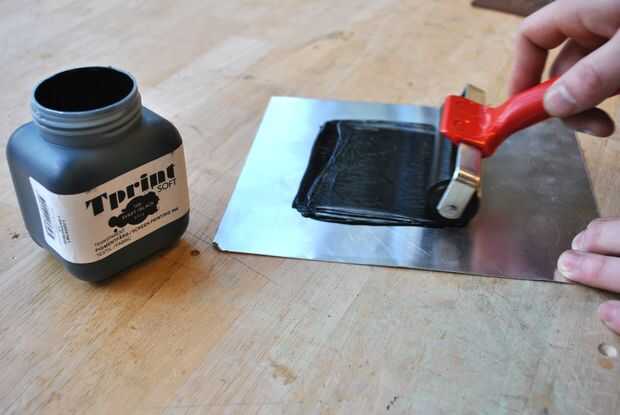 Coloque un trazo de tinta de serigrafía sobre una superficie o tinta de la bandeja. He utilizado una pequeña hoja de aluminio. Comenzar a rodar el rodillo hacia arriba y hacia abajo hasta que la tinta aparezca igualmente. Puede tomar varios minutos para difundir la tinta incluso a través de la placa de aluminio.