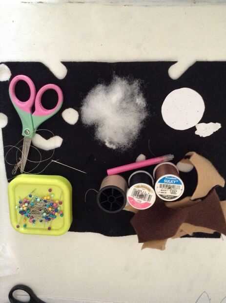 Se necesita: -Fieltro en colores marrón, crema y negro -Hilo en colores marrón, crema y negro -Tijeras craft -Pins -Aguja -Una forma de círculo y una forma de jarabe-ey -Relleno