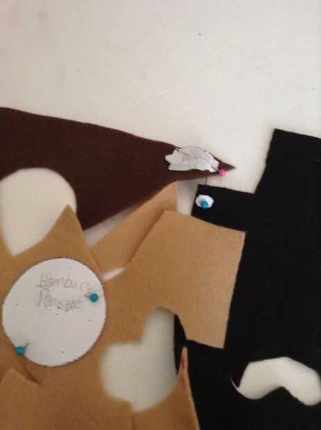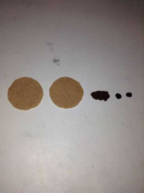Empezar por cortar las formas que se muestra arriba. 2 círculos de crema, 2 círculos negros, 1 pedazo de jarabe marrón y pieza cuadrada amarilla 1 (opcional).