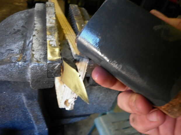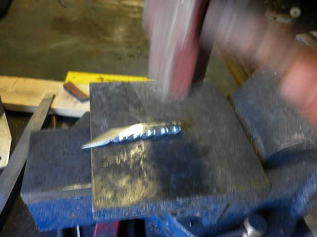 Elegí para no pulir los lados y a mano frotarlos con un papel de lija de 240 grano. Luego usé un martillo grande sobre los extremos planos para hacer una mirada forjada (si eres forja la hoja usted puede dejar los lados solo y solo muelen los cartabones). Alternativamente usted puede moler y para pulir los lados.
