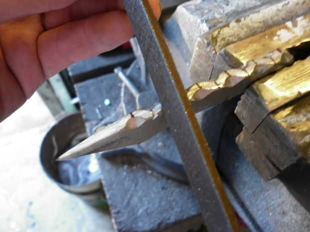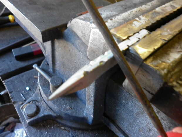 8. Incline el archivo abajo para que un lado es casi tocando la pieza de trabajo, entonces trabajando en un patrón semicircular hacer un surco en forma de una espina