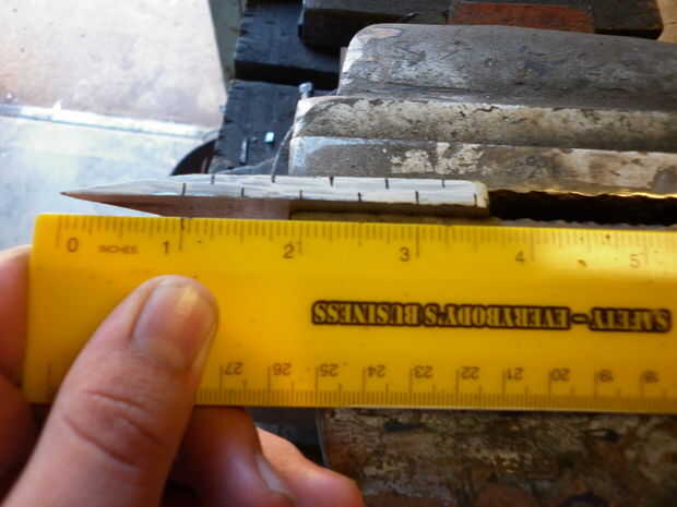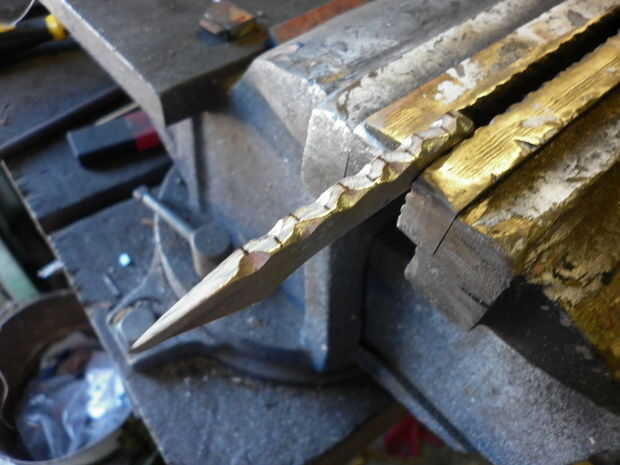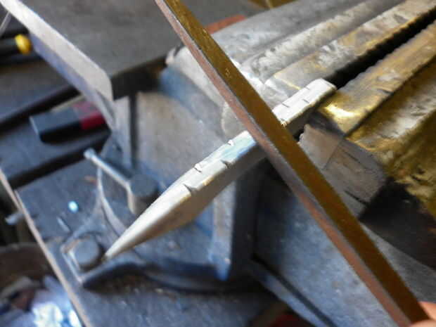 Nota: Debe hacer Filework recocido, o hecho en una hoja que tiene una espina más suave (como mis instrucciones, si seguido, hará). Archivos de diamante pueden utilizarse para filework en un disco duro. Hacer filework pre tratamiento de calor se traducirá en cierta escala formando en el filework - cuando voy para una mirada forjada este termino, así que a pulir las piezas levantadas con mojado y seco y dejar el resto en negro, como salían de la fragua. Pueden eliminarse con presentación o un ácido etch (no recomendado).