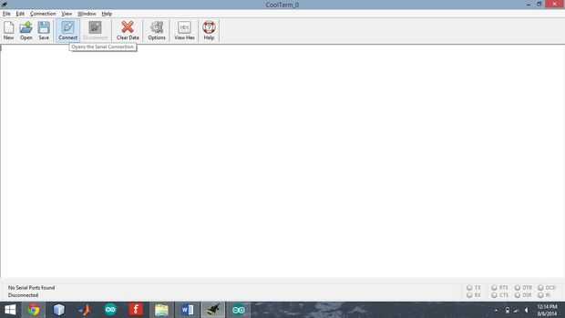 CoolTerm abierta con el fin de obtener los datos del puerto serie. Haga clic en 'Conectar' para enlazar el software para el microcontrolador Arduino Uno.