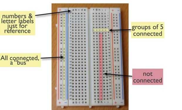 Cuando la placa se sostiene verticalmente como se muestra en la figura anterior, el positivo y el negativo líneas funcionamiento verticalmente en los laterales, no se conecta a cualquier otra cosa pero los puertos en las líneas. La parte media de la placa se conecta horizontalmente (a-b-c-d-e y f-g-h-i-j). Sin embargo, el valle que atraviesa el centro del tablero divide las líneas horizontales en dos secciones. No hay vertical links en el centro.