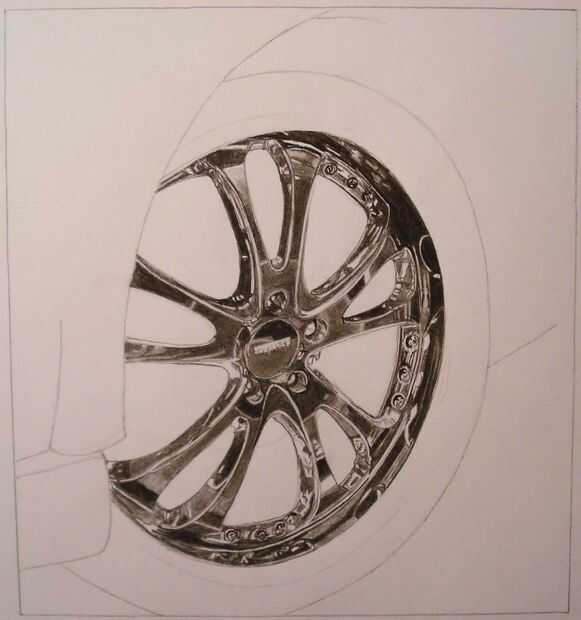 Ahora podemos llenar la llanta con el grafito hasta el círculo que hicimos en el primer contorno. Esto no es demasiado difícil de hacer. Dibujar las partes principales con un portaminas y entonces agregar el resto.