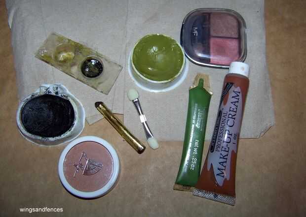 Utilizamos algunos teatral maquillaje crema que puede recogerse en las tiendas de fiesta y es especialmente prominente en casi todas las tiendas durante la temporada de Halloween. No se olvide de los kits de maquillaje que ofrecen un pequeño paquete de goma de espíritu o látex líquido además de paletas de color, ya que estos son a menudo suficientes materiales para este traje. Los principales colores que trabajamos son: marrón, verde y amarillo un poco.