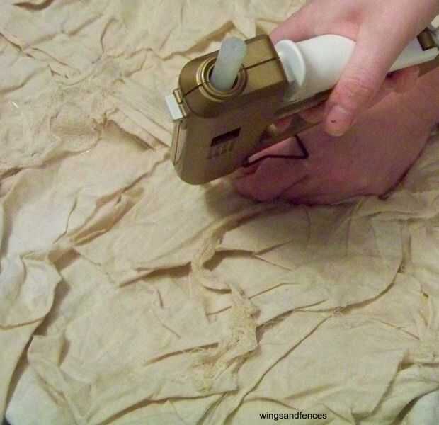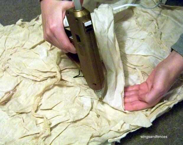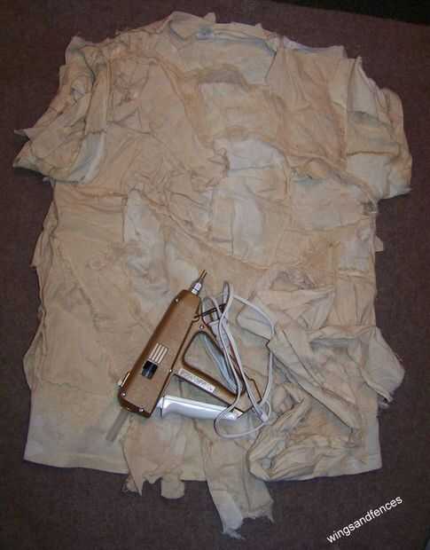 Para la camisa y pantalones (y zapatos si lo desea), al azar te pegue las tiras de muselina teñidos y pedacitos de gasa en las superficies exteriores. No hay ningún patrón a seguir, sólo se superponen a los tejidos y continuar construyendo el traje añadiendo algunos estopilla aquí y un pedazo rasgado de muselina allí. Relajarse... usted no puede equivocarse.