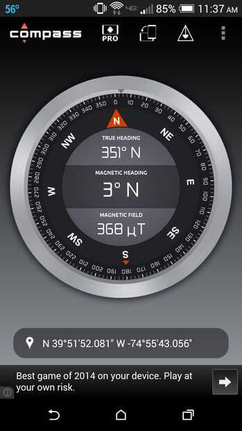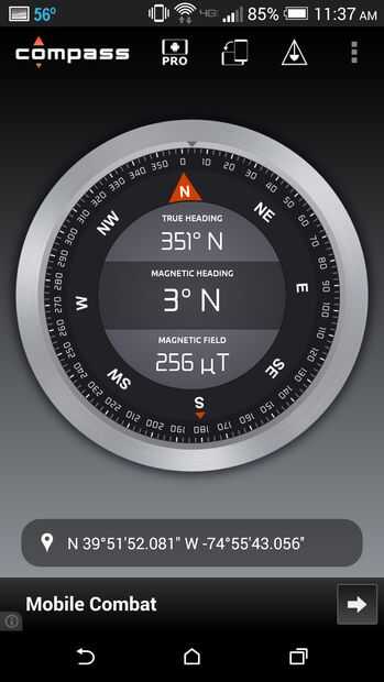He encontrado una aplicación para Android (simplemente llamada "Compass") que también muestra la fuerza del campo magnético (medido en micro tesla, o μT) y solía para tomar lecturas en tres condiciones diferentes. Aquí están los resultados, también se pueden ver las fotos/capturas de pantalla arriba. Tenga en cuenta que estos valores son aproximados (si quería ser realmente científica sobre esto, haría ensayos múltiples y tomar un promedio):