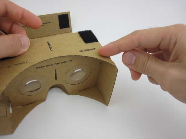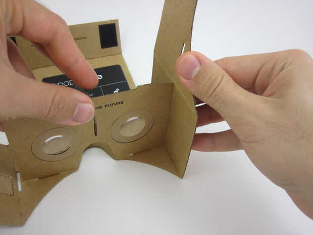 - Coloque la boquilla para una ficha va en la parte inferior de los auriculares, y una ficha va en la parte delantera de la placa frontal, como en la imagen. Si tienes suerte, estas dos piezas deben permanecer estables por su propia cuenta y no caigan. Si no, tendrás que usar una mano para sostenerlos en su lugar mientras usted dobla todo para arriba.
