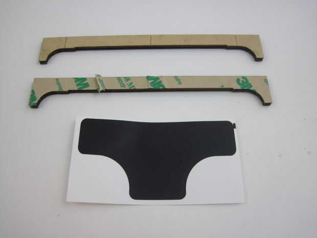 Estamos a la izquierda con una pegatina de misterio y dos trozos de misterio de cartón. Las piezas de cartón con adhesivo por un lado, por lo que se significan para ser pegado a algo... no estoy seguro que aunque. También no veo estas piezas aparecen en el video de la Asamblea. No pasé un montón de tiempo intentando averiguar donde ir, así que si ves una respuesta obvia, por favor deja un comentario.