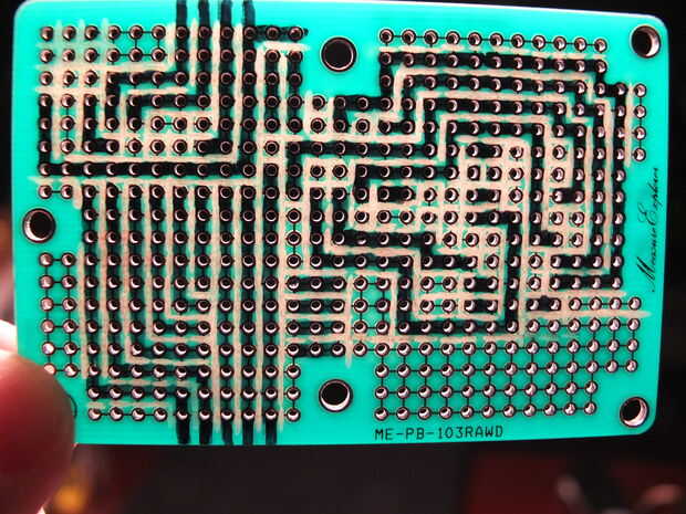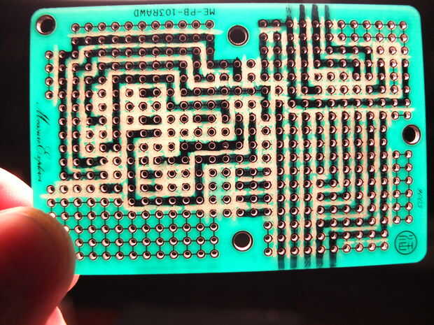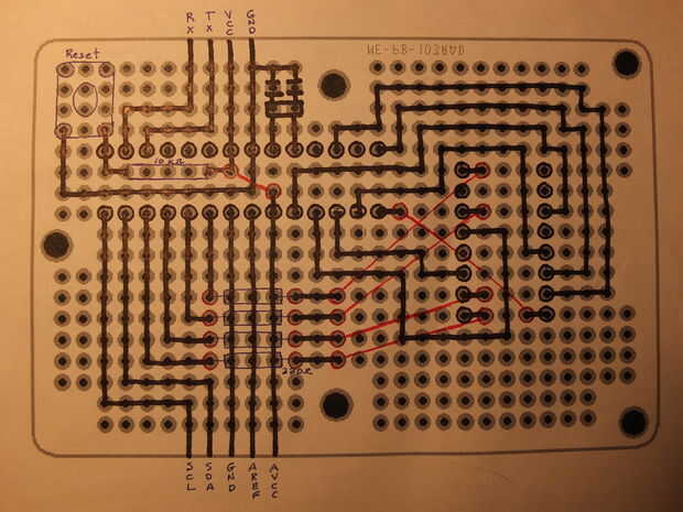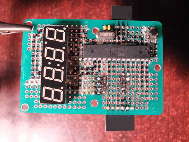 He dado una serie de fotos que muestran el mapa de la Junta que improvisó (usted puede encontrar uno mejor) y el frente y atrás del tablero después utilicé mi dremel para cortar el circuito. La demostración de los dos últimos cuadros frente y parte posterior de la placa acabada. Tiene pernos de cabecera para que puede ser desarrollado, programado y comunicado con. También nota que saqué las resistencias de 330 ohmios que van a los displays de 7 segmentos y reemplazándolas con resistencias de 100 ohmios ya que quería mostrar un poco más brillante.