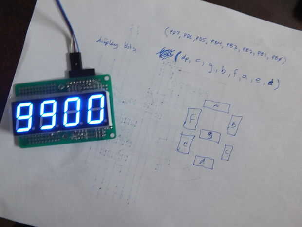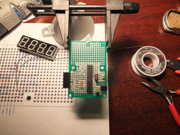 Como de costumbre, usted debe comenzar por conectar la pantalla a su placa de prototipos y prueba de cada segmento para asegurarse que usted entiende cómo está conectado. A continuación, debe conectarlo a los pines de un microcontrolador AVR en el protoboard y ejecutarlo desde allí hasta que tenemos todo nuestro código de trabajo en este tutorial. Por último, al final, debe construir la Junta externa y soldadura en. Luego al probar el producto final se sabe que los problemas vienen de su trabajo de soldadura y corte y no el código. Además, no olvidó el conocido axioma de carpintería "medir dos veces y corte una vez", o en el caso de fabricación de placas de circuitos: "cortar dos veces, una vez la soldadura. Como se puede ver en el cuadro, yo finalmente se rompió y compró el perfecto accesorio Dremel para este tipo de trabajo. Un "sistema del punto de diamante". Costó 5 dólares pero eso es mucho menor que el coste de la terapia de manejo de ira que viene con effing por mi trabajo muchas veces en una fila.