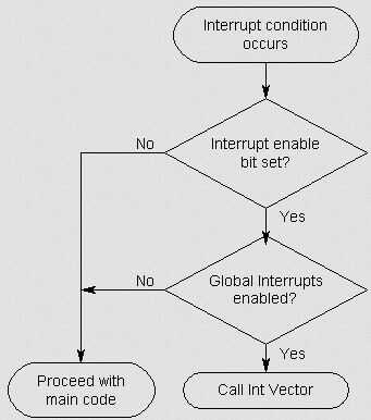 Echa un vistazo a la imagen de arriba. Se trata de la decisión en el proceso de elaboración de la "PC" cuando algunos fuera de influencia "interrumpe" el flujo de nuestro programa. Lo primero hace cuando recibe una señal de fuera que se ha producido una interrupción comprueba si hemos puesto "habilitar la interrupción" es poco para ese tipo de interrupción. Si no tenemos, entonces sólo sigue a ejecutar la siguiente línea de código. Si hemos fijado ese poco de habilitar interrupción particular (de modo que hay un 1 en ese lugar de bits en lugar de 0) entonces comprobará o no hemos habilitado "interrupciones globales", si no nuevamente ir a la siguiente línea de código y continuar. Si hemos activado las interrupciones globales así, luego se vaya a la ubicación de memoria de programa de ese tipo de interrupción (como se muestra en la tabla 12-6) y ejecutar cualquier comando que hemos colocado allí. Así que veamos cómo hemos implementado todo esto en nuestro código.