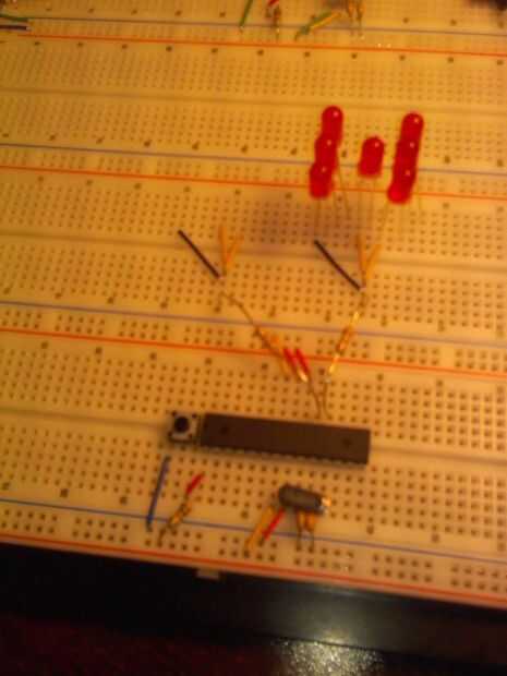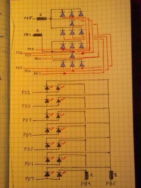 La última foto muestra el diagrama de cableado. Sin embargo, cambié un poco desde que hice el diagrama que invierte la corriente y también decidí usar PortC para cablear los LEDs en lugar de PortD como se muestra en la imagen. La razón es que PortD contiene TX y TX pines para el programador y que la izquierda no suficientes alfileres para hacer lo que quiera. PortB contiene también el oscilador de cristal tan nuevo no hay suficientes pernos para mí. Por lo tanto estoy usando PortC. Eso me da 6 pines de los LEDs exteriores en el centro LED controlo con pin PB1 y un dado.
